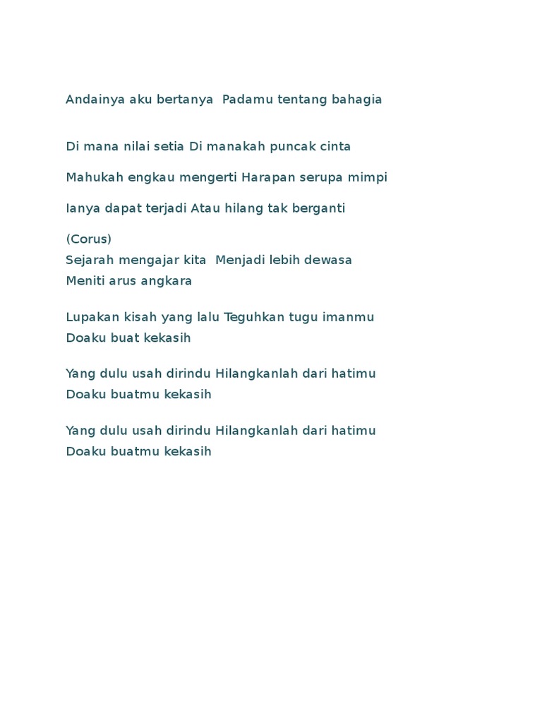 Pabila di giring angin. C G Andainya aku bertanya padamu tentang bahagia F C Dimana nilai setia dimanakah puncak cinta G Mahukan engkau mengerti harapan serupa mimpi F C Ianya dapat terjadi atau hilang tak berganti F C. Lirik Lagu Doa Untuk Kekasih Simfoni Dalam Poket.